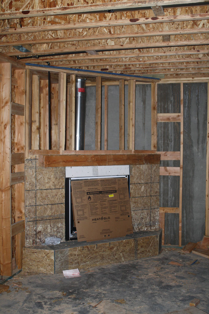 The basement fireplace was having a rock surround, so we actually bumped it out another 1.5" with a 2x8 backer. This way 2" of the beam wouldn't be covered and embedded in the rock and we'd get a deeper mantle.