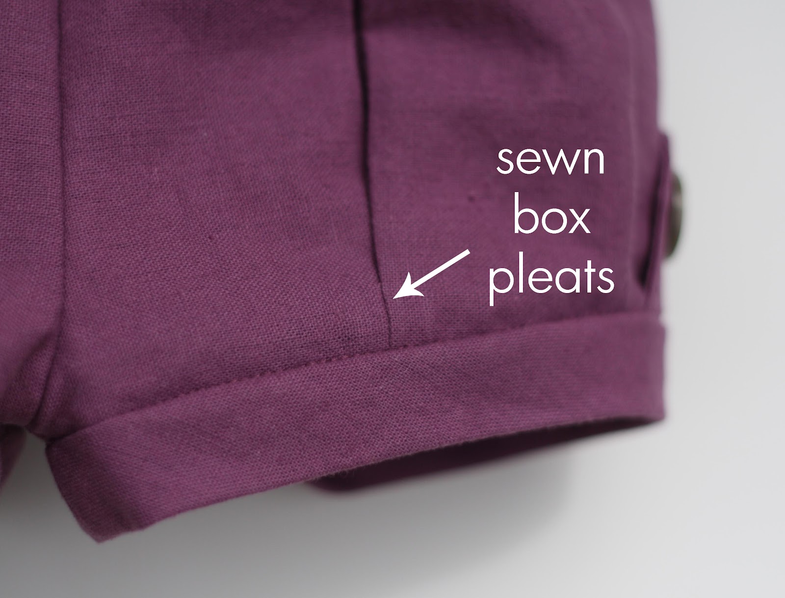 Other than making it smaller and the shorts shorter, the only real change I did was create box pleats. The pattern uses just fold pleats toward the center front, but I chose to sew the pleat, then press it flat from the back to create the open box pleats. With the top and hem pleats, it makes the shorts have the diamond shaped opening.