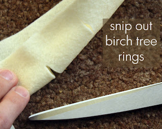 Taking your tree strips, you'll first cut the birch rings. Fold tree in half and snip out a sliver. Vary the width and location of your birch rings throughout trunks of larger trees.